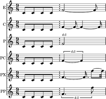 Es folgen einige signifikante Beispiele für die unterschiedlichen Kombinationen von E-Schreibbarkeit vor und nach der Anwendung von Transformationen. Vereinfachend gilt, wie erwähnt, dass diese nur von K-Dauer und Faktor abhängt. Deshalb gelten die folgenden Beispiele und Bedingungen für Geschwister-Verschmelzung entsprechend auch für Synkopen und Hemiolen, solange der Faktor derselbe ist. Einer eigenen Diskussion bedürfen folglich nur die Punktierung und die Fünfer(5)-Synkope.